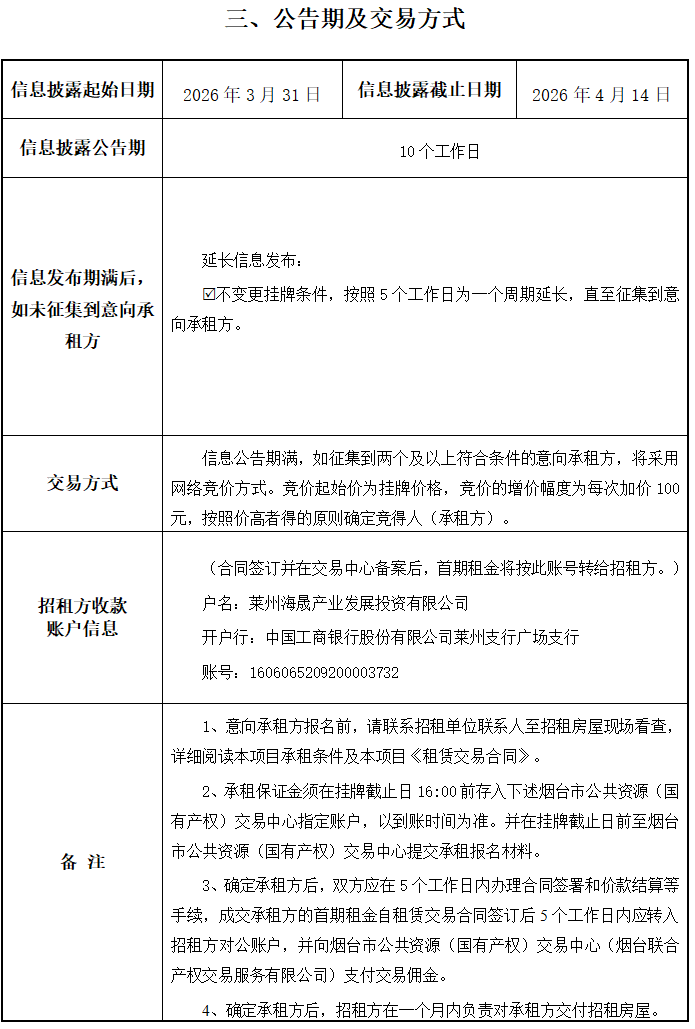 • 掛牌起止日期:2026年3月31日-2026年4月14日